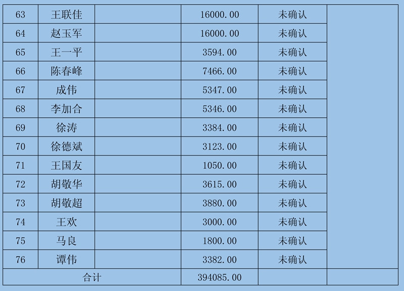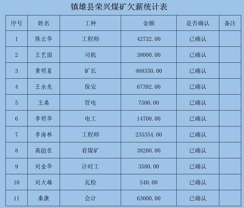 2、本次登記情況:經初核確認,累計共收到12條欠薪申報,涉及12人1595830元;煤礦方已簽字蓋章確認8條,涉及8人413830元。