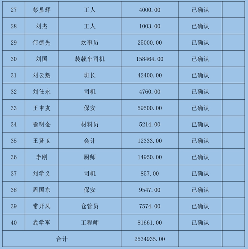 4、復核組意見:①煤礦管理方新提交的5份5人627萬元欠薪資料因證據不足暫緩確認;②羅克雄1415434元雖然提供的證據充足,但由于他是公司的總經理且金額較大,需要再次確認;③其他40條欠薪證據屬實,涉及40人2534935元可以確認。
