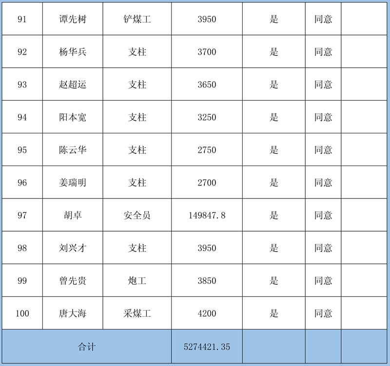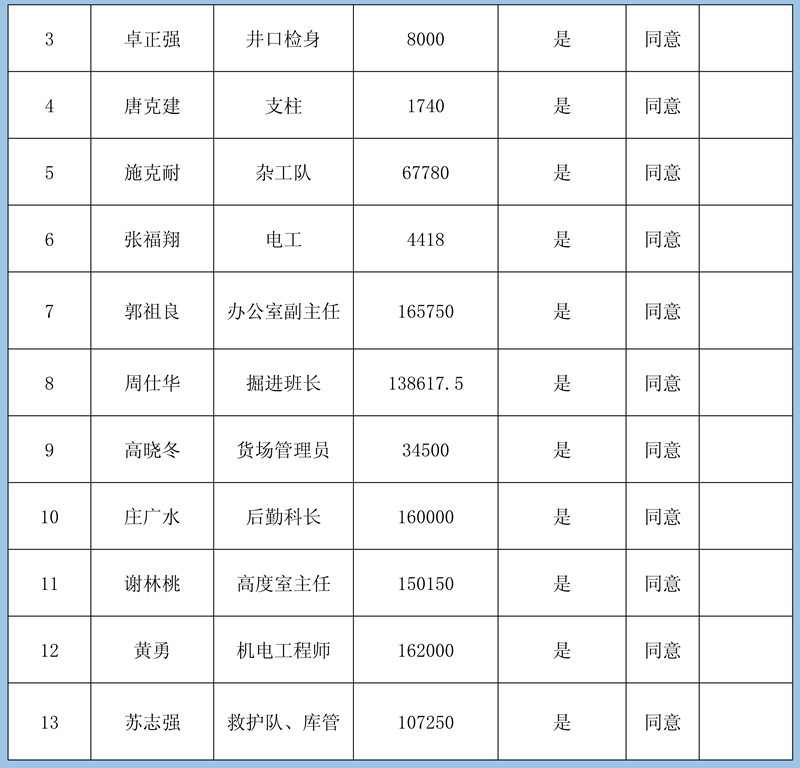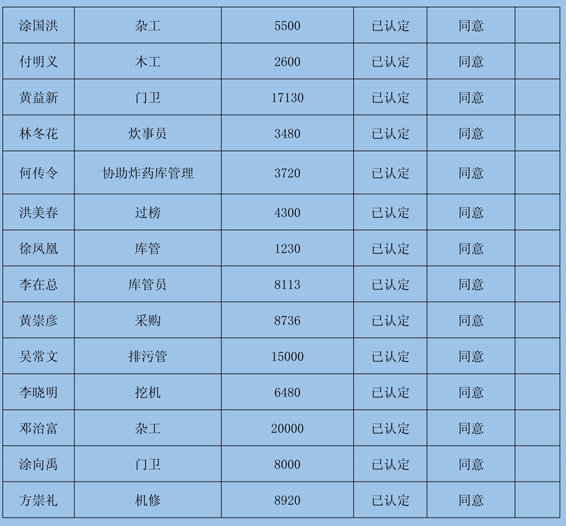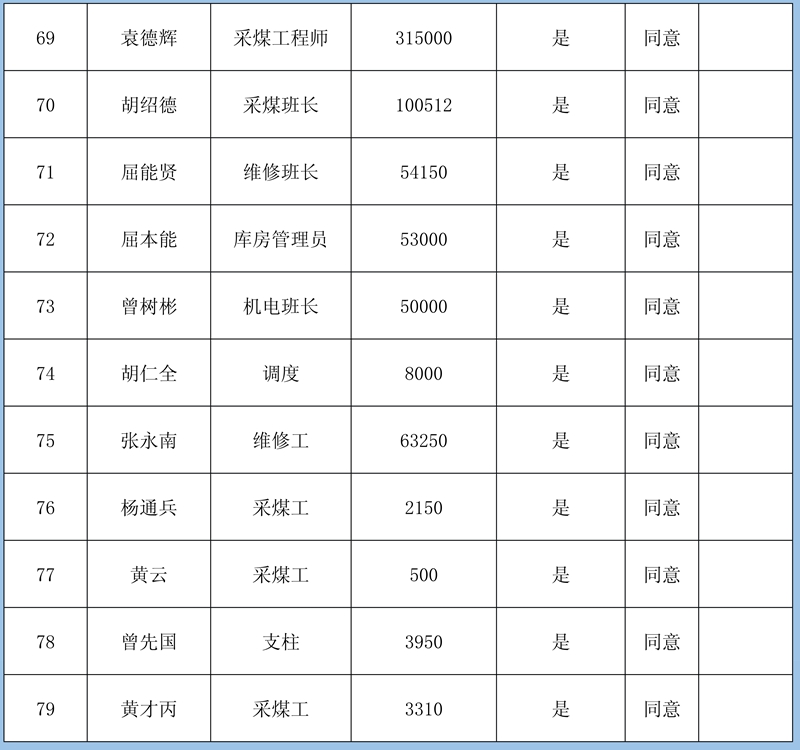 4、復核意見:建議予以確認申報8條金額413830元;需調查核實再行確認3條牟全書、牟全松和白啟波三人的申報,當事人未提供切實欠薪依據,礦方亦不認可;不予確認1條劉永泉申報的欠薪經核實為煤礦轉讓金。