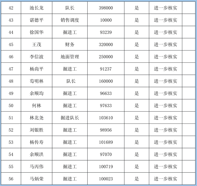 3、其他情況:煤礦方簽字認可的216條欠薪申報,均持有煤礦方開出的工資欠條(蓋章)或是法院判決書等相關依據,實際用工情況無法核實。
