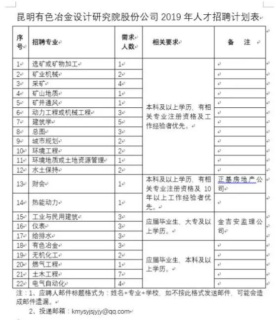 昆明有色冶金設(shè)計(jì)研究院股份公司2019年招聘計(jì)劃表