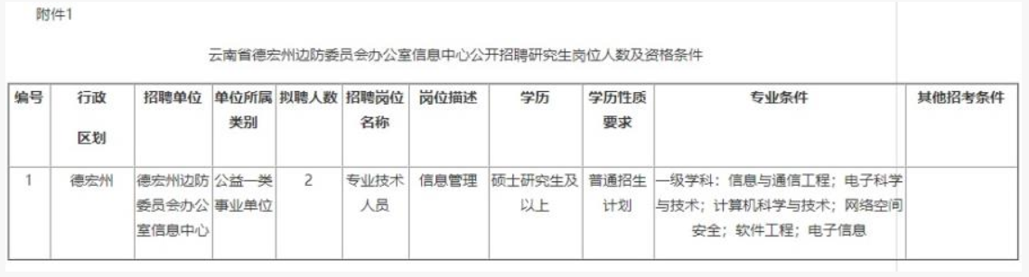 本次面向社會公開招聘碩士及以上研究生學歷人員2名(德宏州邊防委員會辦公室信息中心事業(yè)專技人員2名),具體崗位、條件、要求等詳見(附表1)。