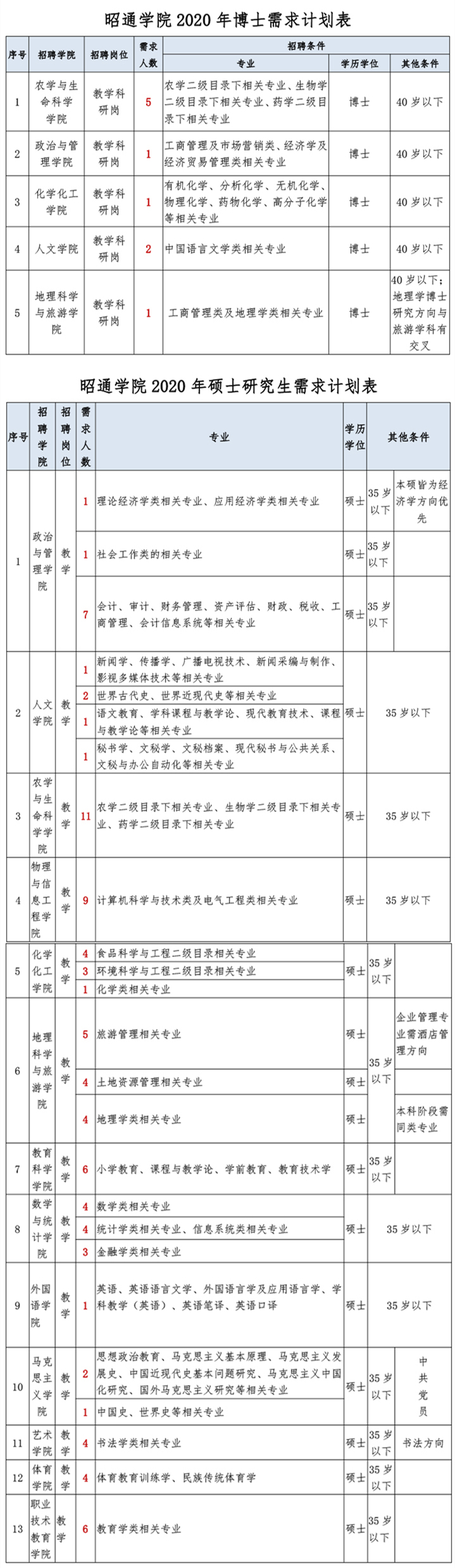 各教學(xué)學(xué)院招聘人數(shù)、專業(yè)等具體要求,以昭通學(xué)院后續(xù)發(fā)布的招聘工作的相關(guān)公告為準(zhǔn)。